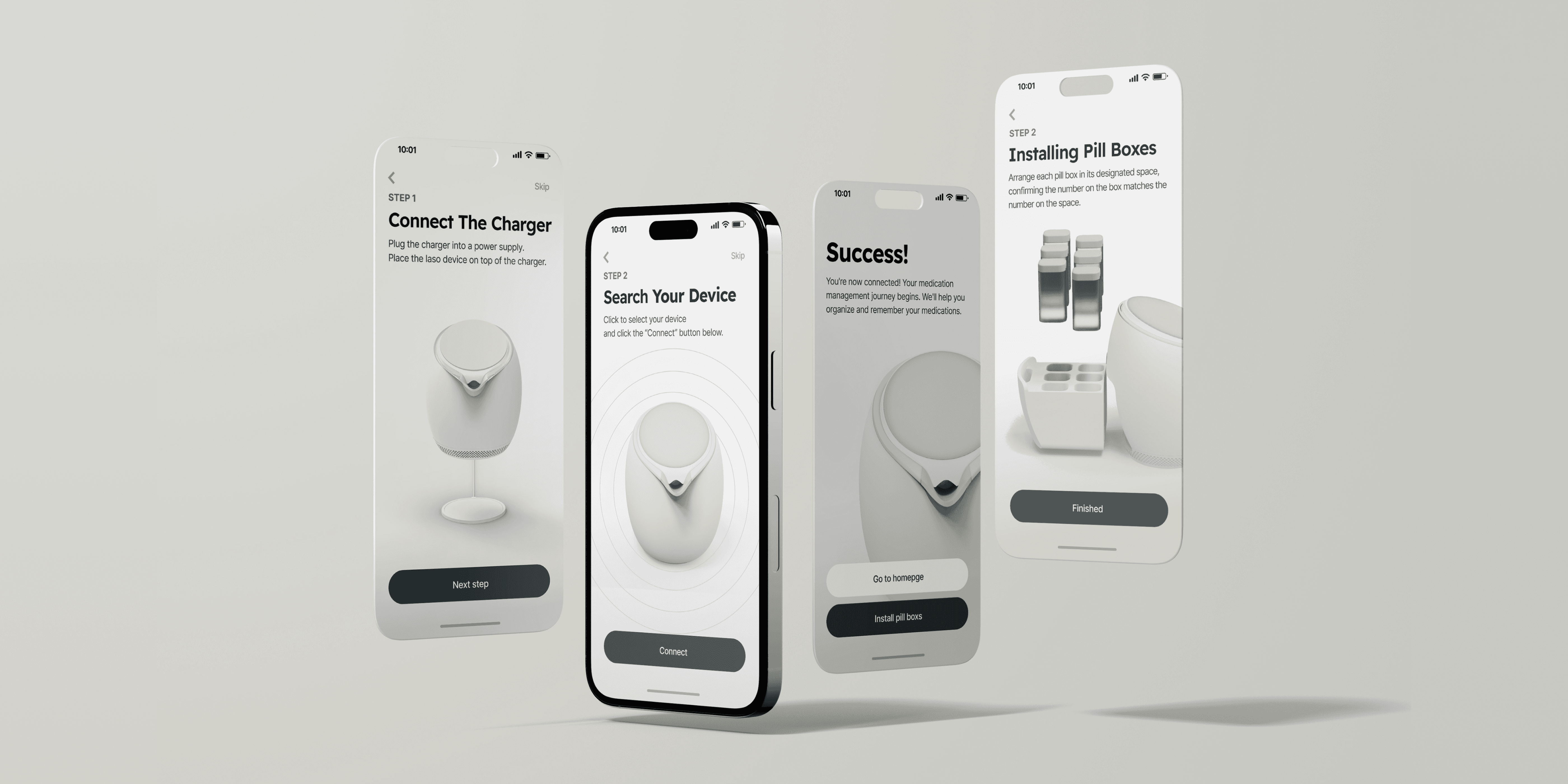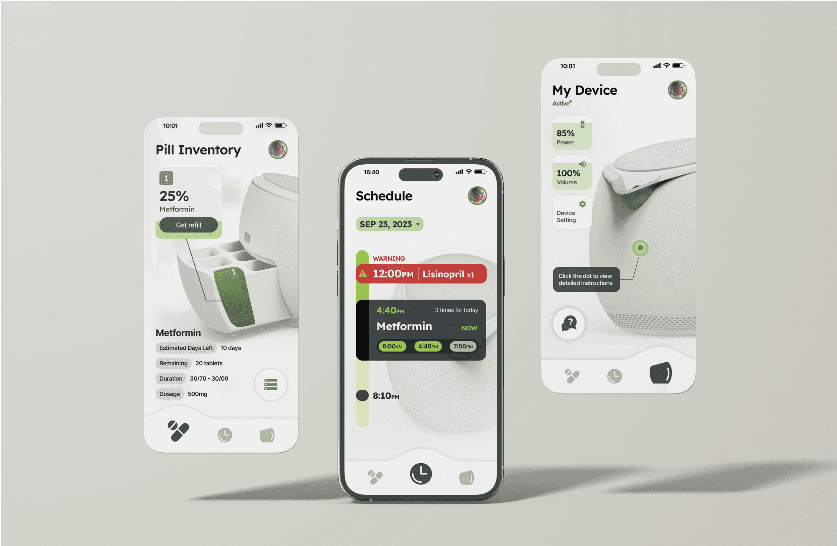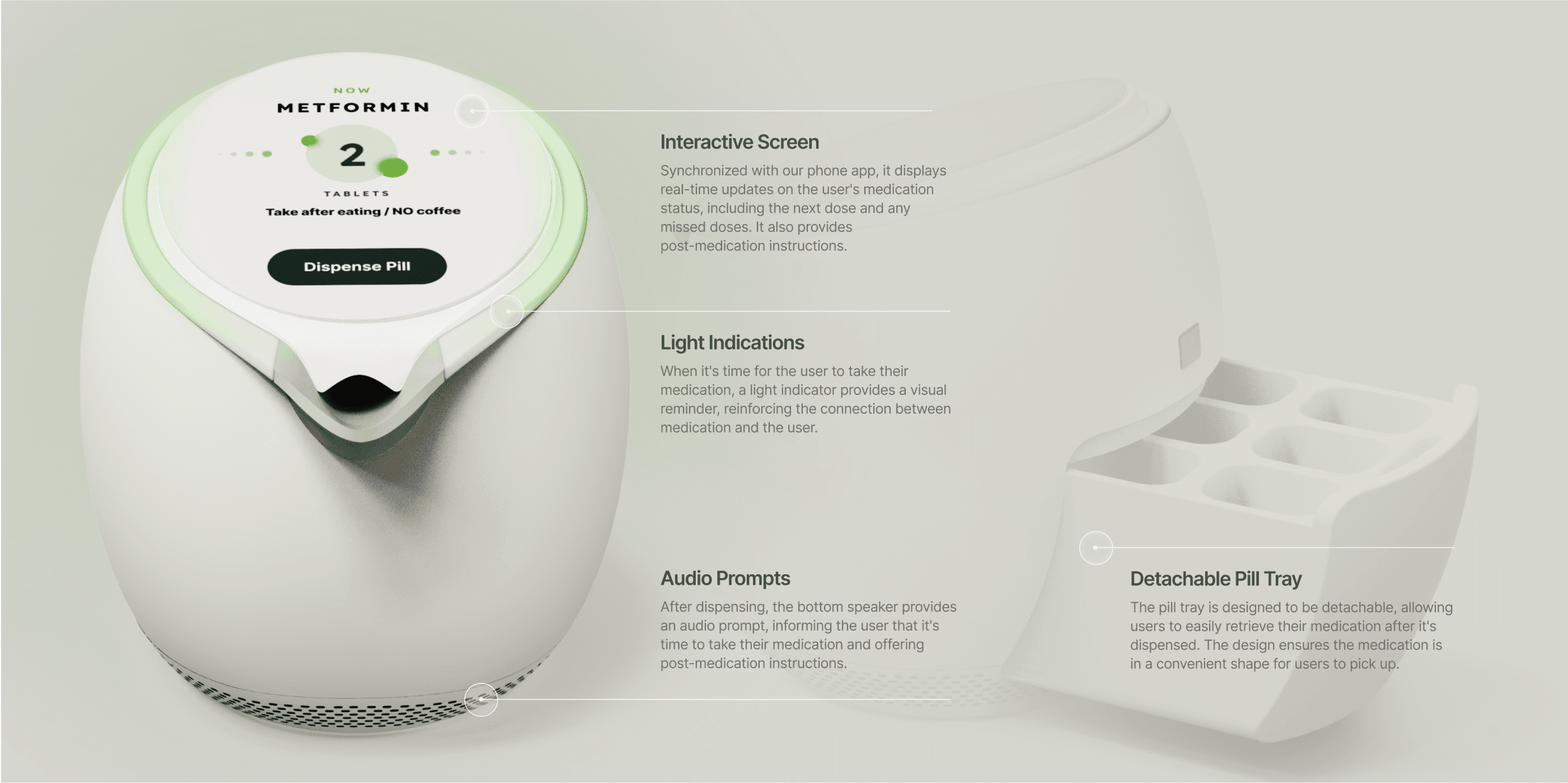 Iaso’s automated dispenser combines user-friendly design with practicality, featuring a rounded, tactile form that adds warmth and simplifies medication management. Enhanced lighting, sound alerts, and reminder functions cater to elderly users, offering a humanized and inviting experience.