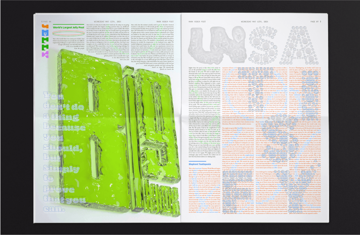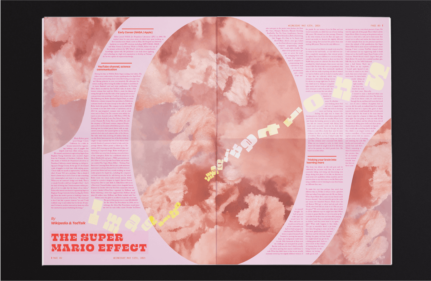 The design of this newspaper draws inspiration from Mark Rober’s unique storytelling approach, where science and engineering become exciting, hands-on experiences. His viral YouTube videos blend education with entertainment, using bold visuals and engaging experiments to captivate audiences. Reflecting this, the newspaper experiments with typography, layout, and color to mirror his dynamic style. Just as Rober simplifies complex topics through creative demonstrations, this design transforms structured information into an interactive, visually compelling narrative that sparks curiosity and excitement for science.